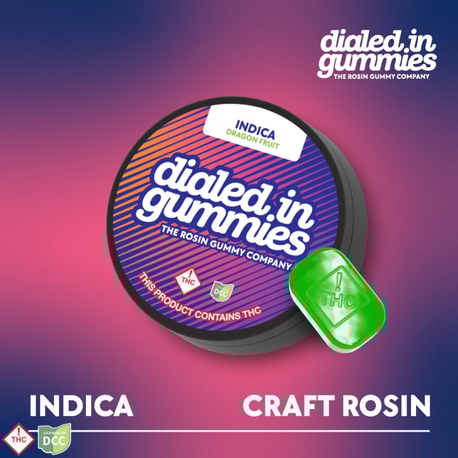 Enjoy our full-spectrum rosin Indica gummies. Crafted in 10 mg servings, each pack holds 10 gummies and rotates through flavorful, award-winning profiles with our signature strain-specific taste and texture. Always solventless, always small-batch—Dialed In for a refined Indica experience.