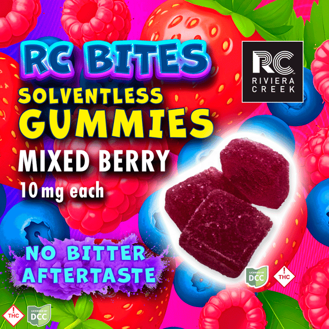Berry Bold, Berry Blissful Sweet. Tangy. Totally irresistible. Get swept up in a juicy rush of flavor with RC Bites Mixed Berry Gummies — a bright, sweet-tart blend that delivers smooth, solventless berry goodness in every bite. No bitterness. No chemical aftertaste. Just clean, delicious fruit flavor. Each gummy is infused with Riviera Creek cannabis grown using our aeroponic method, a clean, carefully controlled process that keeps the plants pesticide-free and quality-focused from start to finish. This ensures a smooth, consistent edible that lets the berry flavor shine the way it should. • Sweet, tangy mixed berry flavor • Made with pesticide-free cannabis grown through clean aeroponic cultivation • Solventless for pure, smooth, never-bitter taste • No chemicals. No shortcuts. • Always 100% Riviera Creek quality 10mg per gummy, 30 mg per pack.