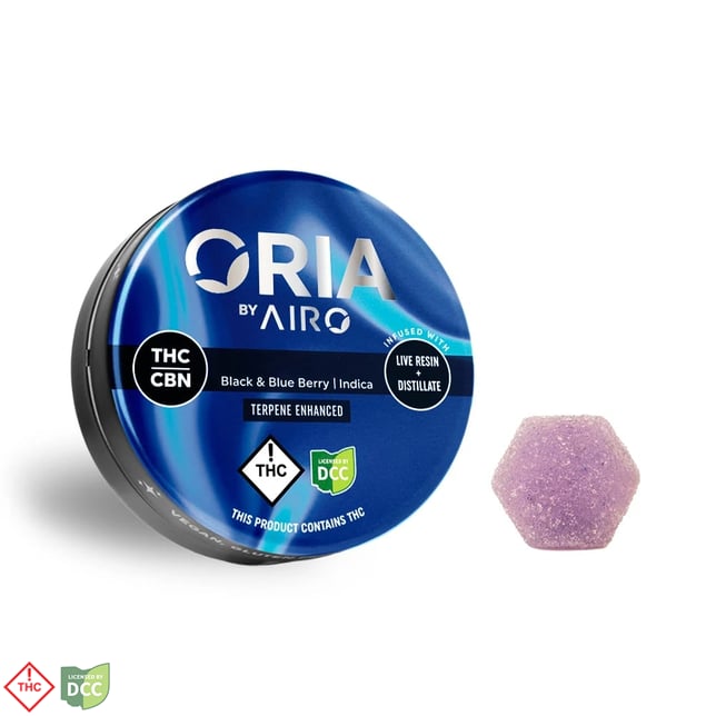 Explore the soothing taste of Oria Crescent Blues gummies by Airo Brands. These Indica 10mg THC and 5mg CBN gummies taste like a fusion of blackberry and blueberries, in a full-spectrum, live resin and distillate gummy.