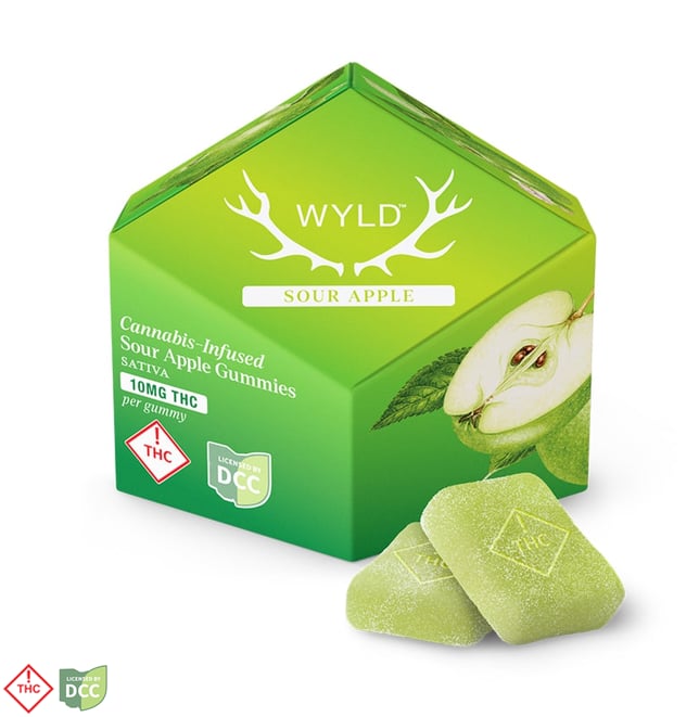 Wyld's mouth-watering Sour Apple gummies are infused with THC and Sativa terpenes for a vibrant, uplifting high. Made with real fruit + great for enhancing moments.